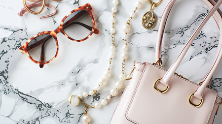 A flat lay of stylish accessories including sunglasses, a handbag, and jewelry on a marble surface.