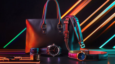 Elegant accessories are arranged creatively with a striking black bag, luxurious watches, and vivid neon lighting that brings a contemporary flair to this chic arrangement.