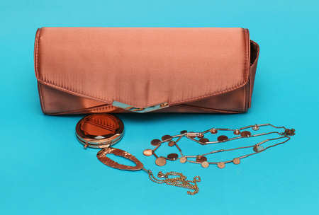 The women's small handbag is beige in color with a gold cosmetic case and phone on a blue satin fabric.
