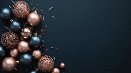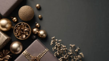 Christmas or New Year composition. Gifts, Christmas decorations on dark blue background. Flat lay, top view, copy space