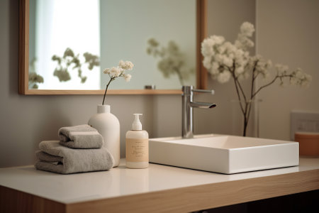 Bathroom interior with sink, mirror and flowers in vase