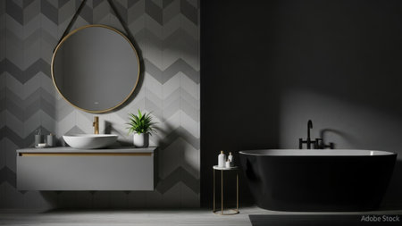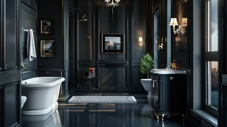 Luxury black bathroom interior with bathtub and gold decor 3D rendering