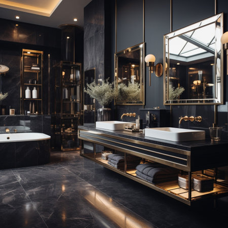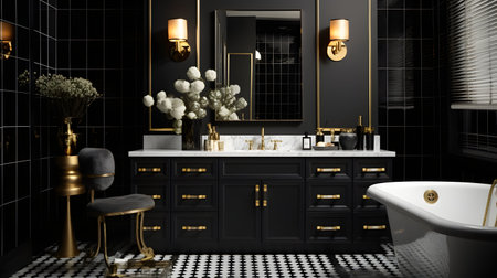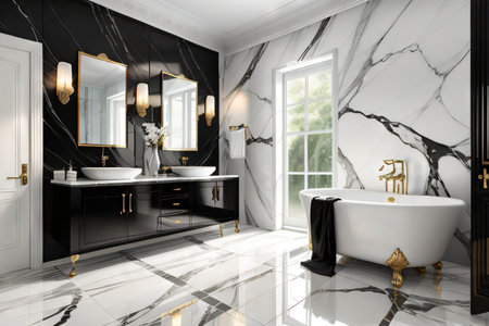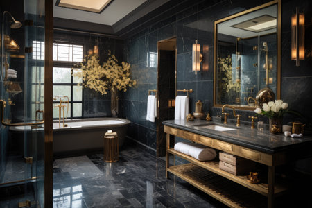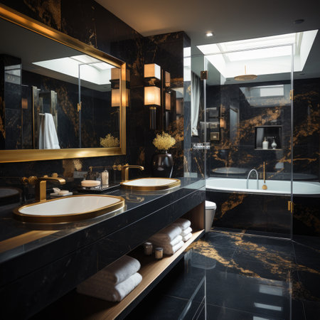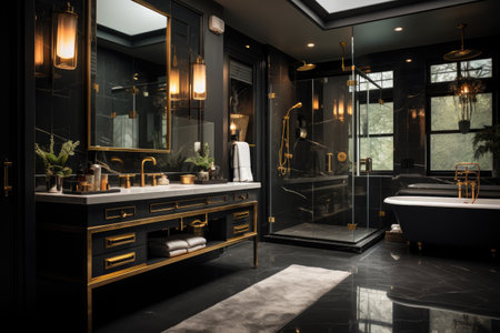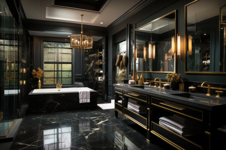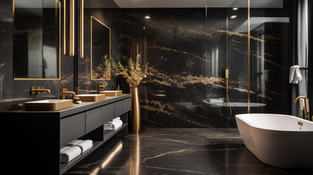 Luxury bathroom with black marble and gold wall and floor tiles