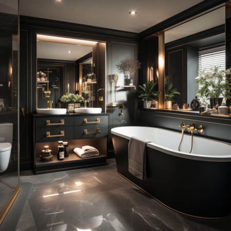 Bathroom interior with black and gold walls, black floor, double sink and black bathtub. 3d rendering