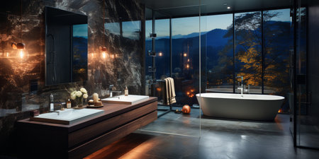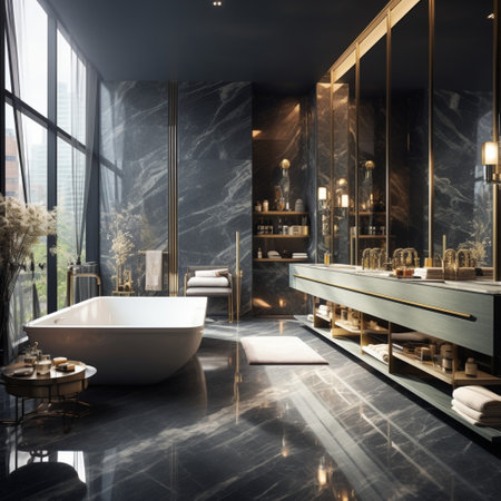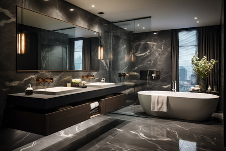 Luxury bathroom interior with black marble tiles and tiled floor