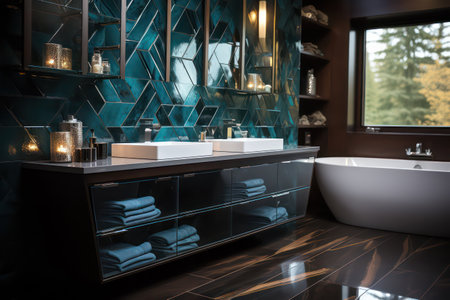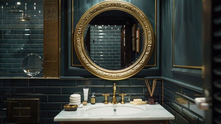 the bathroom features a serene ambiance with a subtle blue color palette, elevated by gold accents that add a touch of luxury and sophistication, creating a relaxing retreat perfect for unwinding after a long day, with elegant fixtures and modern amenities. ai generated