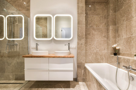 Interior of a luxury bathroom with white bathtub and double sink