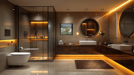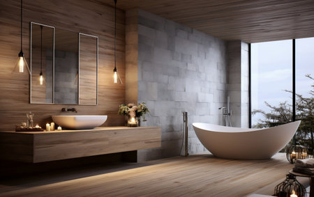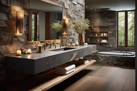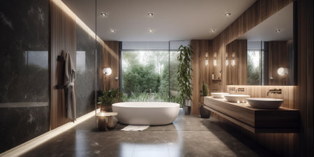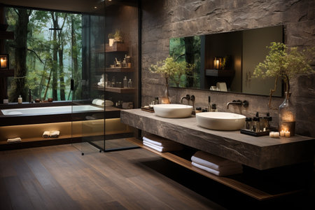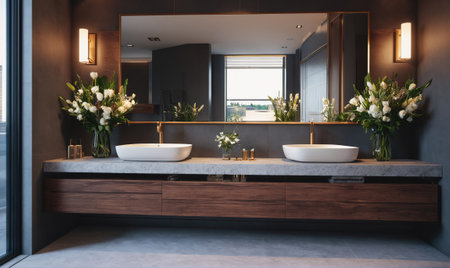 Modern bathroom with double vanity and natural decor elements in soft lighting. That the image is generated using AI.