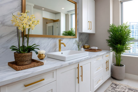 White bathroom vanity with marble countertop, gold fixtures, and orchids, creating a luxurious and elegant atmosphere