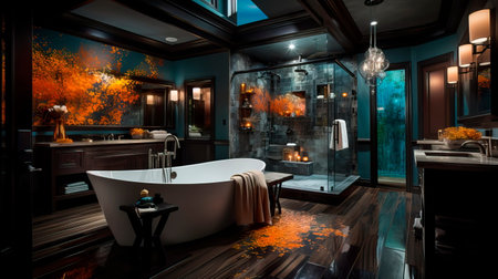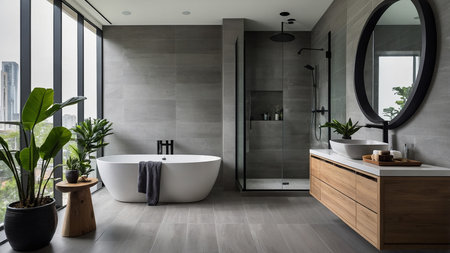 Interior design of Bathroom in Contemporary style with Freestanding Tub decorated with Glass Shower, Subway Tile material. Modern architecture. Generative AI AIG24.