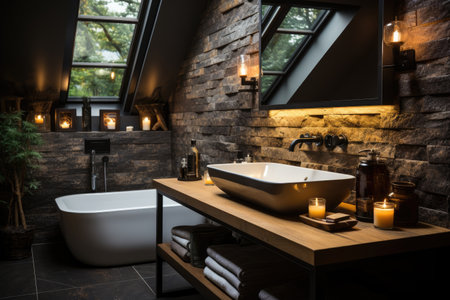 Interior of modern luxury bathroom with brick wall and wooden bathtub