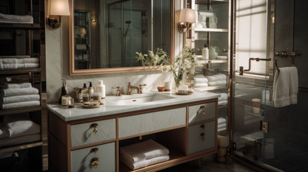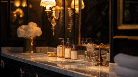 A sophisticated bathroom vanity showcasing elegant decor, luxurious perfumes, and warm lighting. This serene space embodies relaxation and beautiful design elements.