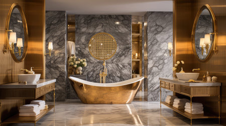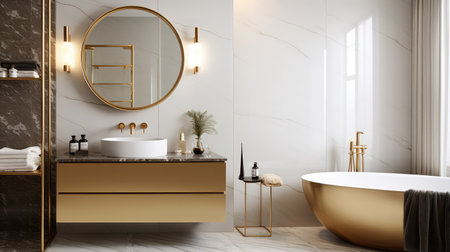 A luxurious golden bathtub in the light-colored gorgeous bathroom. Generative AI AIG27.