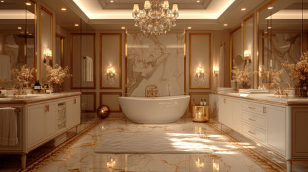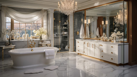 luxurious bathroom design featuring marble countertops and a crystal chandelier, creating an elegant interior concept