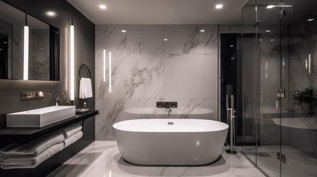 Interior design of Bathroom in Minimalist style with Freestanding bathtub decorated with Marble, Glass, Chrome material. Modern architecture. Generative AI AIG24.