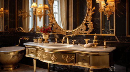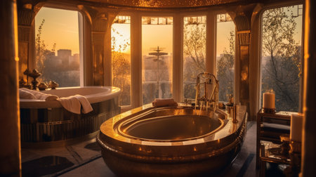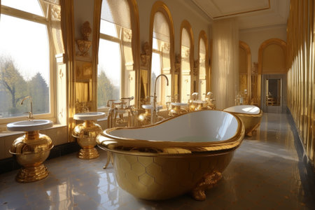 A golden luxury and futuristic palace with golden bathtub. Generative AI AIG27.