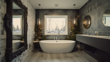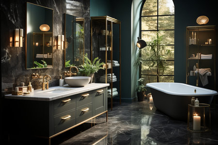 Luxury bathroom interior with black bathtub, mirror and tiled floor