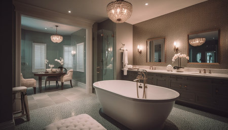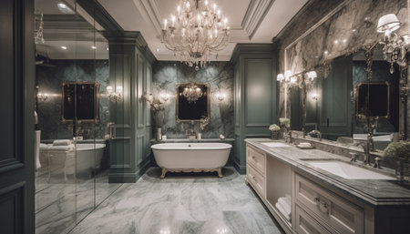 Modern luxury bathroom with elegant marble flooring and illuminated chandelier generated by artificial intelligence