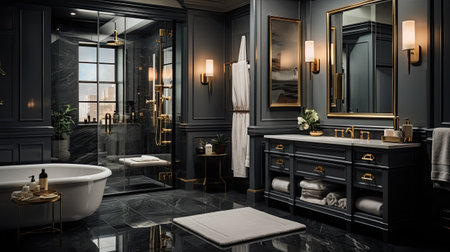 a contemporary bathroom adorned with New England decor, to highlight the sleek design elements against the backdrop of dark walls, creating a striking contrast and evoking a sense of opulence