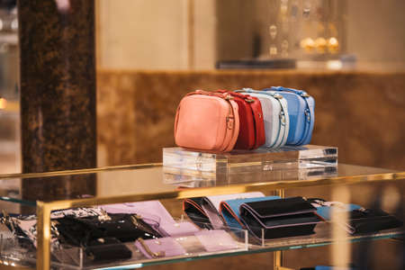 Designer fashion handbag clutch in the shop of shopping mall. Bali island, Indonesia.