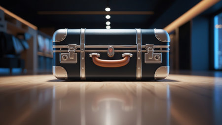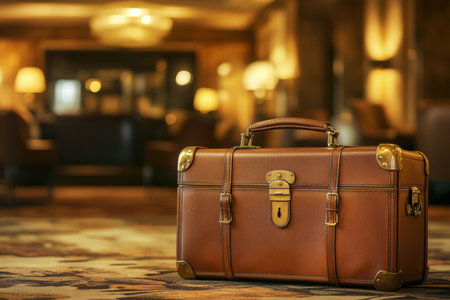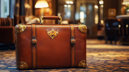 Elegant leather suitcase features golden hardware, resting on the plush carpet of a sophisticated hotel lobby, creating a warm atmosphere.