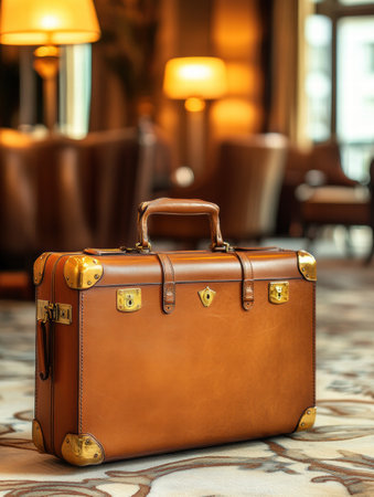A vintage leather suitcase placed in an elegant, classic interior with warm, ambient lighting.
