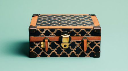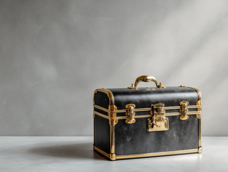 A vintage black suitcase featuring elegant gold accents, placed on a light surface. The design showcases a classic style, perfect for travel or decorative purposes.ai generated.
