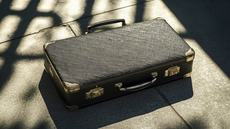 This image captures a vintage black suitcase with metal clasps, elegantly positioned on pavement, creating a striking interplay of light and shadow.