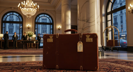 Beautiful leather suitcase featuring golden hardware rests on the plush carpet of an upscale hotel lobby, surrounded by warm lighting.