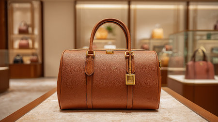 Luxurious Brown Leather Handbag Displayed Elegantly in a High-End Boutique Setting