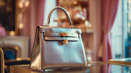 Elegant metallic handbag with golden lock displayed in a luxury setting.
