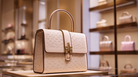 Elegant ivory handbag with golden clasp showcased within a luxury boutique