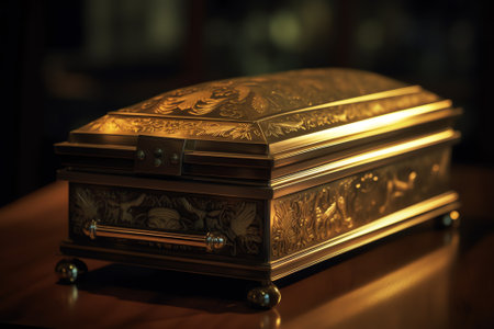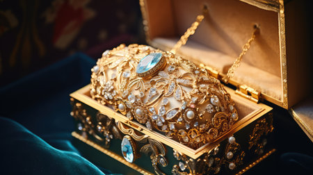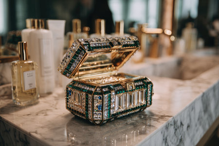 Highly decorated, golden jewelry box, embellished with numerous gemstones, including emeralds and diamonds, is positioned on a marble countertop. The box's intricate design and the luxurious materials create a stunning display of craftsmanship and opulence. Surrounding the box are other luxury items, suggesting a wealth of high-end products.