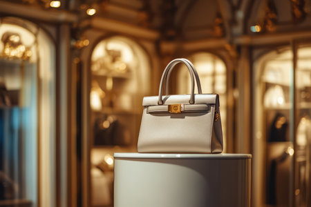 High-end white handbag displayed under spotlight on pedestal in glamorous boutique setting, showcasing modern fashion and luxury branding.