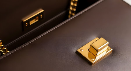 A detailed macro shot focuses on the polished, shiny gold clasp and hardware of a high-end, dark brown leather handbag. The image highlights the quality craftsmanship, fine stitching, and elegant details that define a luxury fashion accessory.