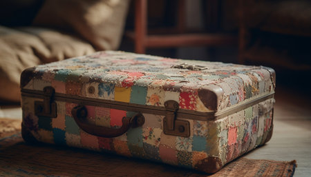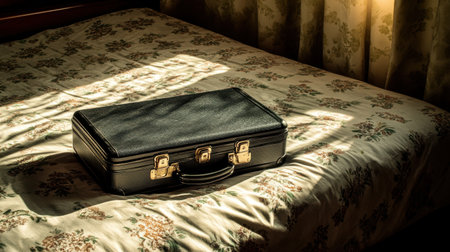 A vintage leather suitcase sits atop a floral patterned bedspread, illuminated by gentle sunlight, creating a nostalgic ambiance perfect for travel-themed visuals.