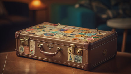 A vintage suitcase with stickers and labels from different countries, suggesting a life of travel and adventure.