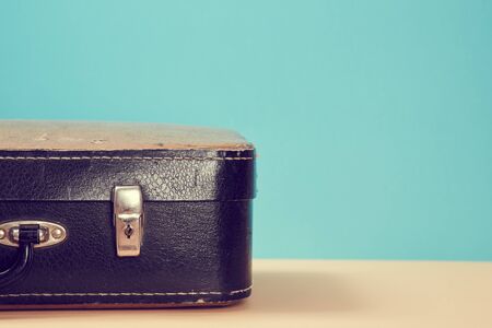 Travelling background. Adventure concept. Vintage leather suitcase for travel, trip on blue backdrop, place for text.
