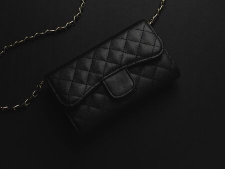 Top view of elegance women's accessories fashion black shoulder leather bag with golden chain.