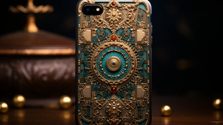 A stylish smartphone rests among shiny gold jewelry, sparkling gems, and ornate boxes, creating an elegant display of affect.