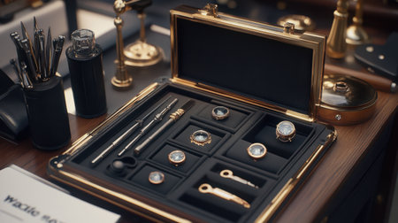 Discover a sophisticated collection of luxury writing instruments and elegant accessories showcased in a beautifully crafted display case on a polished wooden desk.