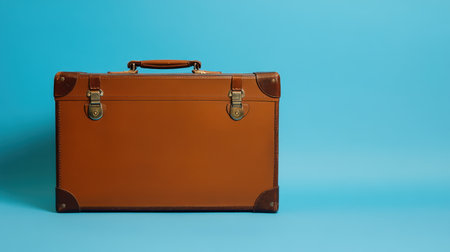 Classic vintage leather suitcase stands against a vibrant blue backdrop, ideal for travel-themed imagery, adding a nostalgic touch to any design or photography project.