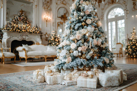 Luxurious holiday-themed interior featuring a beautifully decorated christmas tree adorned with white roses and golden ornaments. presents wrapped in elegant paper surround the tree. the opulent setting includes ornate furnishings, a grand fireplace, and soft ambient lighting. Generative AI