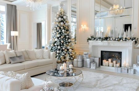 A luxurious living room decorated for Christmas with a stunning white and silver theme. Features a grand fireplace and an elegant Christmas tree.