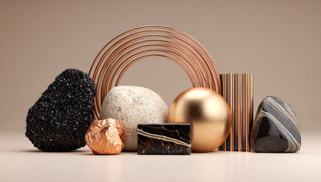 An artistic arrangement features diverse stones and metallic elements, with a coiled copper arc. The objects are set against a soft, light background, creating depth. The composition evokes a sense of modern design. This image could be utilized in various commercial and editorial projects.