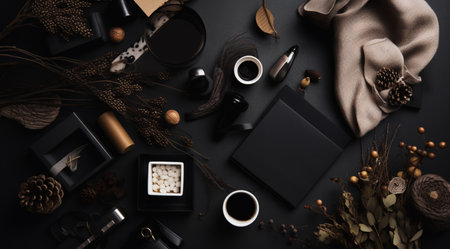 A top-down view showcases a modern workspace layout with a laptop, smartphone, coffee cup, and various accessories arranged on a dark surface. The composition utilizes a monochrome color scheme with varying shades of black and gray. This image could be used for illustrating technology, business, or lifestyle concepts in marketing.