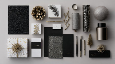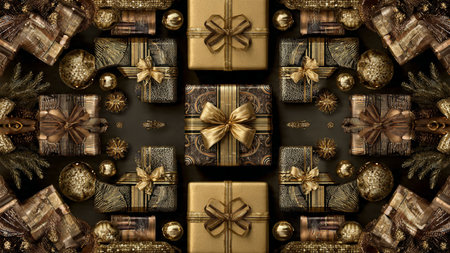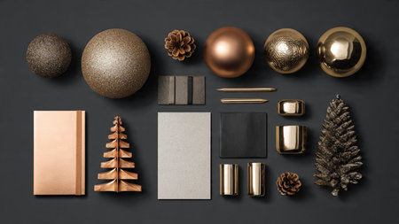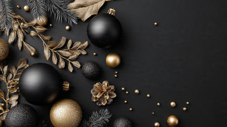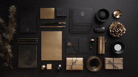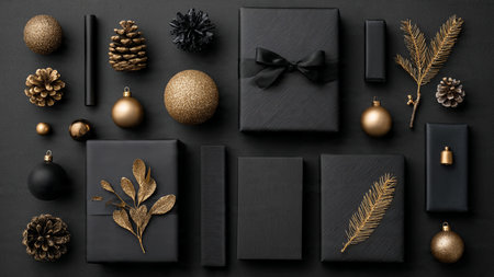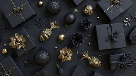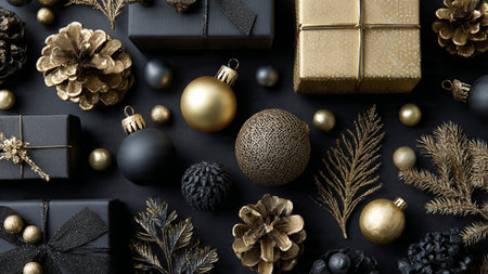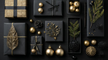 High-end gold decorations arranged elegantly on a matte-black canvas.