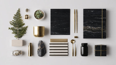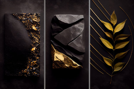Captivating arrangement featuring elegant black and gold textures complemented by floral elements, ideal for stylish design and interior decoration projects.