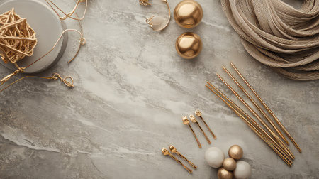A stunning arrangement showcasing gold jewelry pieces and accessories on a refined marble surface, perfect for fashion themes and jewelry marketing campaigns.