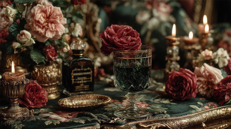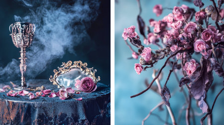 A dramatic composition featuring an ornate candlestick surrounded by flowers, with smoke effects creating a moody and mysterious atmosphere.